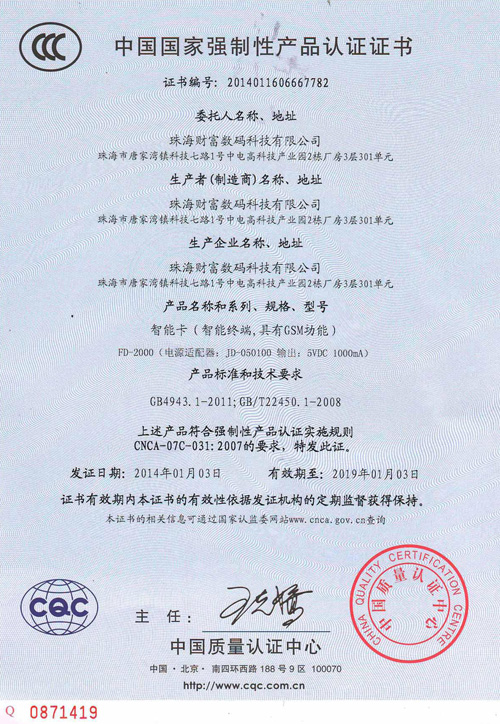 財(cái)富數(shù)碼智能卡順利通過國家信息安全認(rèn)證中心認(rèn)證,取得3C認(rèn)證證書,產(chǎn)品質(zhì)量更有保障,24小時(shí)保障孩子人身安全,家長更放心!