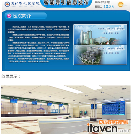 建立數(shù)據(jù)接口,采用全嵌入式網(wǎng)絡(luò)一體液晶播放設(shè)備(嵌入式網(wǎng)絡(luò)一體機(jī)),實現(xiàn)門診掛號液晶顯示、一級分診液晶顯示、二級分診液晶顯示、體檢化驗取單液晶顯示、取藥排隊液晶顯示、科室導(dǎo)引液晶顯示、醫(yī)療宣教液晶顯示等各項功能。是專用于醫(yī)院的一站式液晶醫(yī)療導(dǎo)引平臺。本系統(tǒng)由多媒體信息發(fā)布系統(tǒng)和醫(yī)院分診導(dǎo)引系統(tǒng)兩部分組成。星際互動多媒體醫(yī)療分診導(dǎo)引系統(tǒng),是基于醫(yī)院內(nèi)部計算機(jī)網(wǎng)絡(luò),與醫(yī)院HIS系統(tǒng)