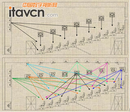 其它多環(huán)繞聲軌系統(tǒng)的墻壁多只音箱通道在重放還音時,多個音響分組發(fā)出的是同一聲道信號,每只環(huán)繞只解決就近區(qū)域的聲音輻射;全景聲的每個通道都是完全獨立的;全景聲的每只音箱都有獨立特性的音頻信號,并要求每只環(huán)繞音箱實現(xiàn)全場聲音覆蓋。
