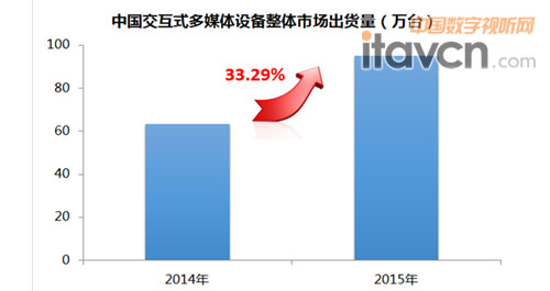 據權威第三方市場調查研究機構中國市場調查研究中心(CMRC)的研究數據顯示,2015年度中國交互式多媒體設備整體市場出貨量為94.78萬套,同比增長33.29%,銷售額 55.13億元。