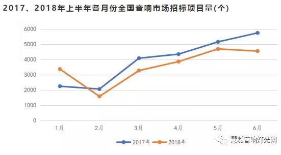 2018上半年音響設備的招標量整體有輕微下滑,但自3月以來,項目均量仍然超過3000筆,5月以及6月更是超過4000筆,整個上半年音響設備項目總量達1.1萬筆。