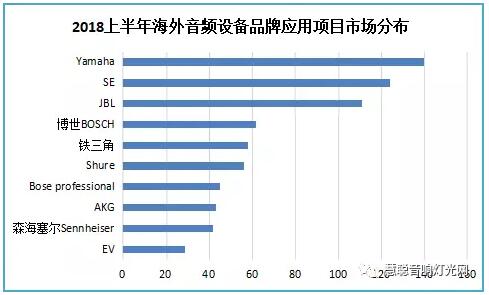 上半年涉及音響設備的公開招標項目中,在中標項目里應用海外音響品牌的市場分布排名上,YAMAHA排名首位,SE排名第二,發展勢頭迅猛,JBL排名第三。排名前十的海外品牌還有:BOSCH、鐵三角、shure、Bose Pro、AKG、Sennheiser、EV。