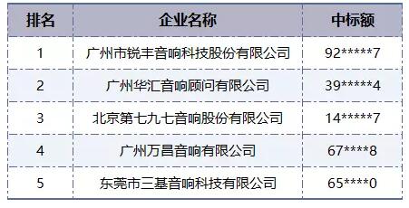 我們從上半年由廠商參與招投標項目的金額以及數量作出綜合統計,上半年音響設備廠商排名首位的是銳豐音響,中標金額超過9000萬,從中標金額上看,遠遠領先于其他同行;華匯音響緊隨其后排名第二,中標金額將近4000萬;排名第三的是七九七,中標金額也有將近1500萬。廣州萬昌音響以及三基音響分別排在第四和第五的位置。