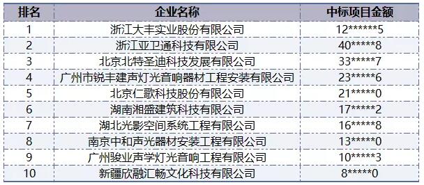 從涉及音響設備的中標工程項目的金額以及數量綜合統計后,上半年中標工程企業排名前十的榜單也出爐了,排在首位的是浙江大豐實業,涉及音響設備的中標工程項目金額超過1.2億元;排名第二的是浙江亞衛通科技,中標額超過4000萬;北京北特圣迪則排名第三,中標額超過3000萬。
