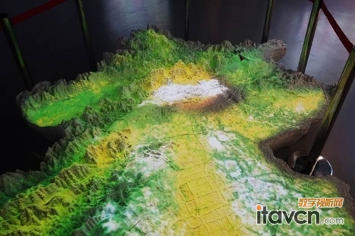 在大廳中央, 一臺BenQ LU951ST 激光工程投影機吊頂安裝,垂直投影出一整塊數字沙盤。
