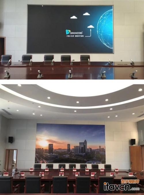 采用DANACOID 162寸互聯(lián)版27.8mm超薄LED智慧會議屏,搭配H.265分布式系統(tǒng),分布式服務(wù)器,集合各個樓層信號源,助力打造一個信息聚合的展示空間。