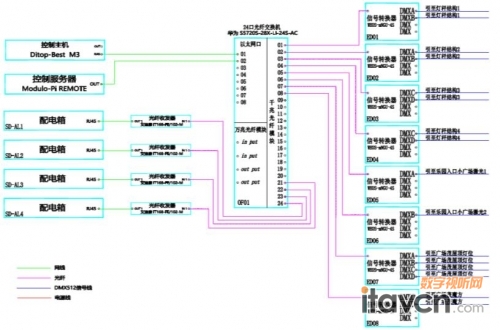 本系統(tǒng)與廣場(chǎng)區(qū)通過光纖將兩臺(tái)光纖交換機(jī)進(jìn)行連接,通過廣場(chǎng)區(qū)的視頻服務(wù)器進(jìn)行控制,將幾個(gè)不同區(qū)域的燈光系統(tǒng)變成了一個(gè)可以進(jìn)行聯(lián)動(dòng)的燈光系統(tǒng),燈光控制臺(tái)僅在調(diào)試時(shí)使用,與廣場(chǎng)區(qū)相同在燈位處都選擇了光纖版的E/D轉(zhuǎn)換器。