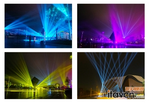 在魔方周圍有20臺(tái)380W防水光束電腦燈,四個(gè)燈桿上各有5臺(tái)功率為470W的三合一電腦燈,除了常規(guī)的電腦燈外,考慮到了光影秀的形式,還在廣場(chǎng)四周的建筑上放置了9臺(tái)激光燈,綠化帶內(nèi)設(shè)有LED彩虹燈、螢火蟲燈、投影燈、LED圓環(huán)。