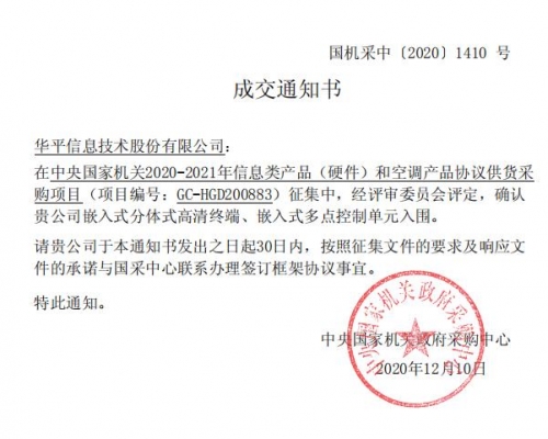 12月10日,中央國家機關(guān)2020-2021年信息類產(chǎn)品(硬件)和空調(diào)產(chǎn)品協(xié)議供貨采購項目(項目編號:GC-HGD200883)入圍招標工作圓滿結(jié)束,華平股份嵌入式分體式高清終端和嵌入式多點控制單元成功入圍。