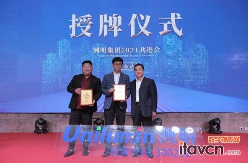 隨后進行的授牌儀式上,洲明集團相關領導為山東區域省級經銷商、集團UIE戰略客戶及七融業務戰略合作伙伴授牌。