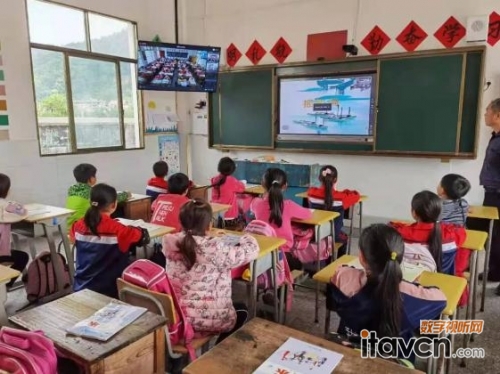 照片來自江西省興國縣,教學點學生正通過希沃交互智能錄播(下稱「希沃錄播」),參與中心校的一堂課。