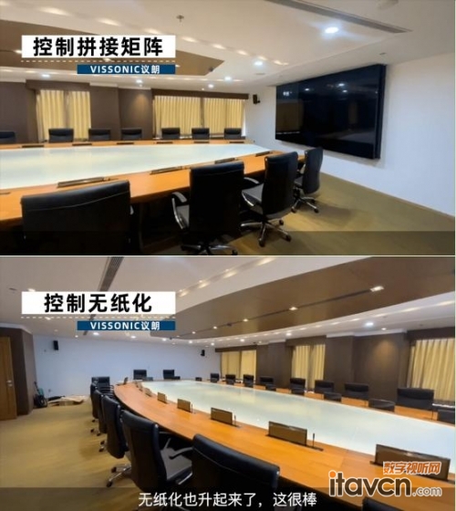【數(shù)字視聽網(wǎng)訊】放眼望去整個會議室非常整潔有序,我們在會議室內(nèi)布置了無紙化會議、拼接矩陣與中控及涵蓋了全會議室的擴(kuò)聲系統(tǒng)。