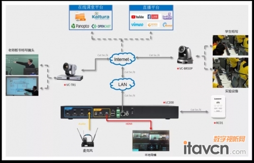 該方案架構為全IP網絡化,支持 PoE,可以任意擴展多機位, 無布線困擾。在自動跟蹤時,可以設定8個屏蔽區域和4個區域跟蹤特寫,利用屏蔽區域功能,將學生及投影白板播放的內容屏蔽,以免被誤觸發跟蹤。設定跟蹤區域,可以實現板書及投影電子白板自動特寫。通過LC200錄播導播界面遠程控制攝像機,無需購置控制鍵盤,降低了整套方案的使用成本。三路推流直播可即時切換場景,如果老師接入電子白板(計算機)時,還可以通過錄播主機直接硬采集白板(計算機)信號。通過本方案實施,老師非常輕松實現了課堂的線上線下教學。