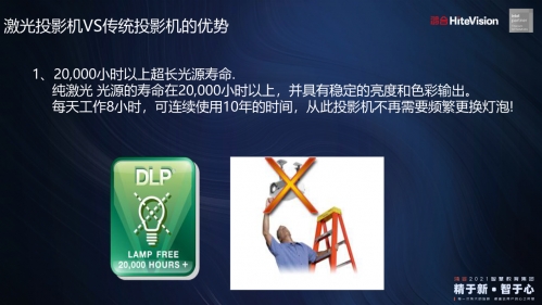 為了減少用戶對投影機(jī)的后期維護(hù)時間和成本,使投影機(jī)擁有更好的防塵性能和更長的使用壽命。鴻合DLP激光長焦投影機(jī)采用純激光光源,保證穩(wěn)定持久亮度輸出的同時,擁有20000小時的超長壽命,節(jié)能環(huán)保,大大降低了使用成本。