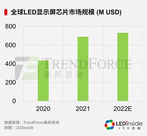 芯片領(lǐng)域,LED芯片市場規(guī)模在2021年躍至36億美金,罕見的45%增速主要?dú)w功于照明、車用LED、顯示屏以及其他領(lǐng)域的增長。其中,LED顯示屏芯片市場規(guī)模接近7億美金,同比增長近6成。