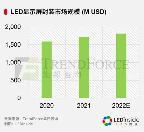 封裝領(lǐng)域,2021年在車用LED、照明及LED顯示屏的主要推動(dòng)下,全球LED封裝市場規(guī)模為176.5億美金,同比增長15.4%。