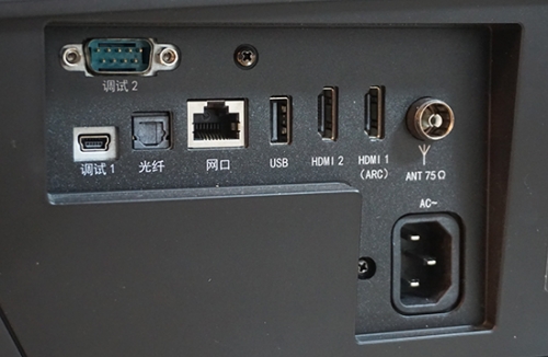 在接口配置方面,中科極光真激光家庭影院X1A應該是我們所見過的所有激光電視產品中接口配置最為豐富的產品之一,其中后置了雙HDMI(其中一組帶信號回傳功能)、一個USB接口、加上機身側面的USB接口即總共配置了兩組USB接口,一個ANT信號接口(激光電視標準中規定的必備接口)、LAN有線網口、光纖接口、兩組調試接口,豐富的接口配置可以滿足多設備的連接信號切換,可以做到無須插拔線纜切換信號。