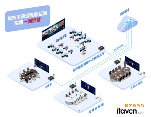 •與電子政務外網視頻會議室、省市縣各級指揮中心等區域的音視頻信號進行對接,實現信號互聯互通。音視頻信號高效低延時切換,解決十堰經開區政府單位之間、上下級之間的協同溝通問題。實現城市運行管理中心統籌全局,多方高效協同,一網統管。