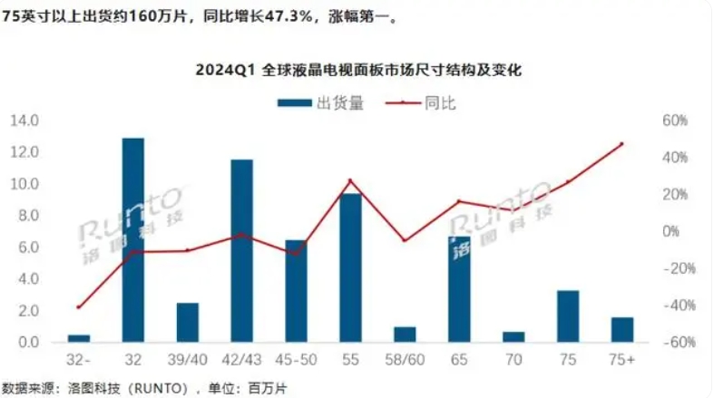 75 英寸出貨約 330 萬(wàn)片,同比大幅增長(zhǎng) 26.5%;75 英寸以上出貨約 160 萬(wàn)片,同比增長(zhǎng) 47.3%,漲幅第一。