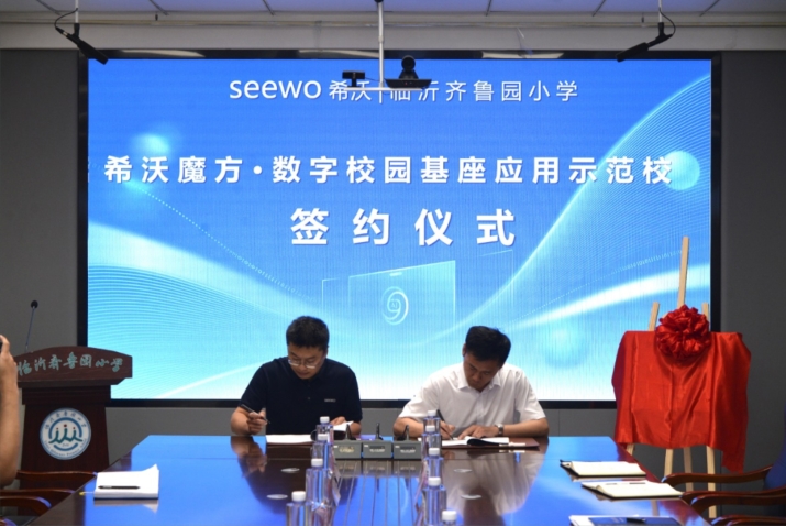 隨后,在所有來賓的共同見證下,希沃山東營銷中心銷售總監馬端旭與臨沂齊魯園小學黨委書記、校長馮維峰上臺簽署希沃魔方·數字基座應用示范校合作協議,并進行示范校授牌儀式。