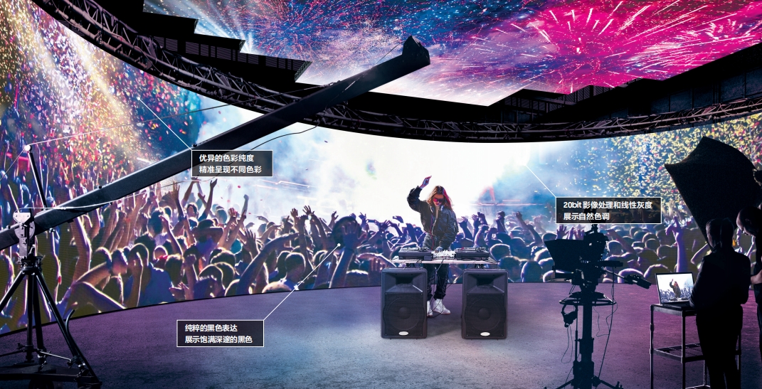 利用虛擬制作技術(shù)創(chuàng)建內(nèi)容,畫質(zhì)是重要因素之一,增強(qiáng)畫面的真實(shí)性是對顯示屏的核心需求。展會現(xiàn)場,三星The Wall虛擬制作專用顯示屏以頂尖的視覺顯示技術(shù)為虛擬拍攝環(huán)境提供了逼真的圖像細(xì)節(jié)與精準(zhǔn)的色彩表現(xiàn)力,自然的季節(jié)更迭和氣候變化展示得惟妙惟肖,光影流轉(zhuǎn)間彰顯出強(qiáng)大的對自然場景的還原能力。三星The Wall虛擬制作專用顯示屏采用黑色密封技術(shù),能夠提供飽滿深邃的黑色,形成強(qiáng)烈的對比度;超色度技術(shù)讓每種顏色都能更準(zhǔn)確地呈現(xiàn);高達(dá)20bit影像處理和線性灰度提供真實(shí)的色調(diào),突顯出各種復(fù)雜場景的細(xì)微差別,顯示連續(xù)的自然陰影和純色調(diào),確保在攝像機(jī)上呈現(xiàn)近乎真實(shí)的場景效果。