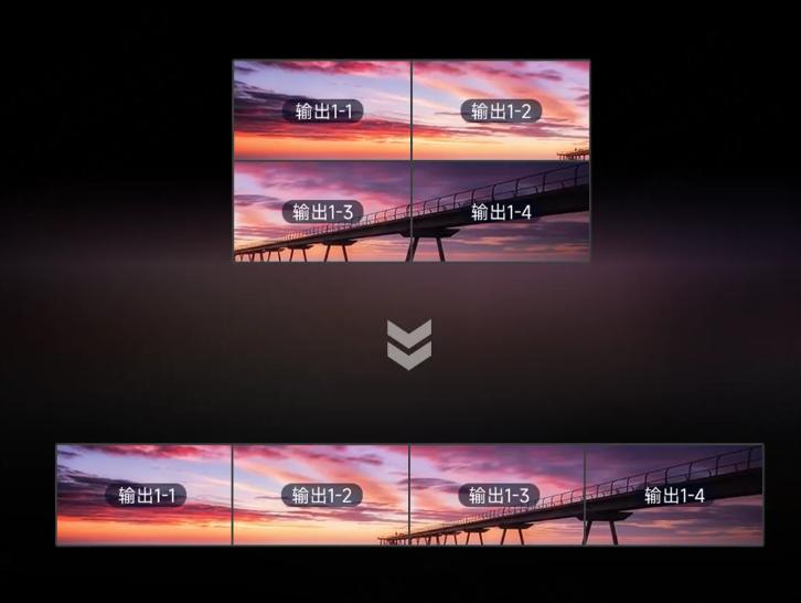 輸出口拆分重組,輕松解決接口超長分辨率輸出問題,最大可拆分為1024區域,讓長條屏顯示更加靈活自由。