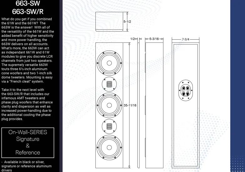 RBH 663-SW/R 配備三個堅固的 6.5 英寸鋁質錐盆低音揚聲器和一個絲質球頂高音揚聲器,提供深沉、富有沖擊力的低音和水晶般清晰的高音,精確而清晰。