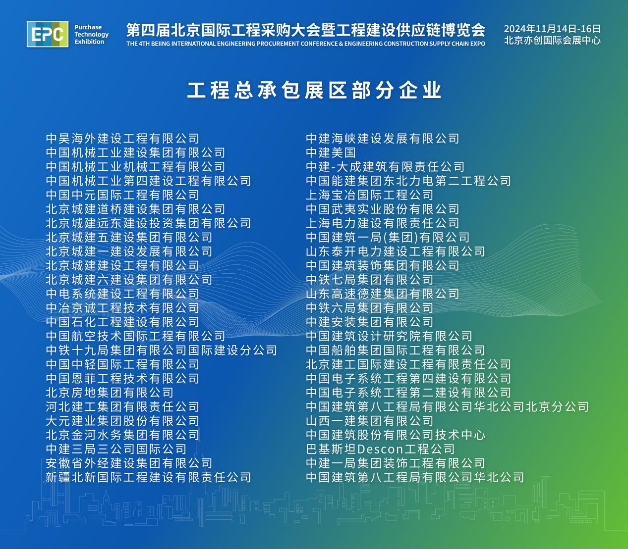 EPC2024將于2024年11月14-16日在北京.北人亦創國際會展中心舉辦,本屆展會以“綠色低碳、高效融合”為主題。展覽涉及綠色建筑材料與裝飾材料、電梯、綠色電力能源、管材管件、防水材料、工程施工機械設備、裝配式建筑與集成房屋、模板及腳手架、工程物流、EPC工程總承包、設計咨詢、專業承/分包、采購與供應鏈平臺、供應鏈金融服務、建筑木材與木制品、石材、鋼材鋼筋等,涵蓋工程產業鏈全鏈。