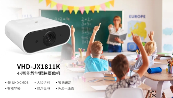 首先,針對優秀教學內容缺乏有效記錄手段的問題,維海德引入了自主研發的4K智能教學攝像機VHD-JX1811K,吊裝在教室中后排區域,從而實現對講臺區域的覆蓋拍攝。
