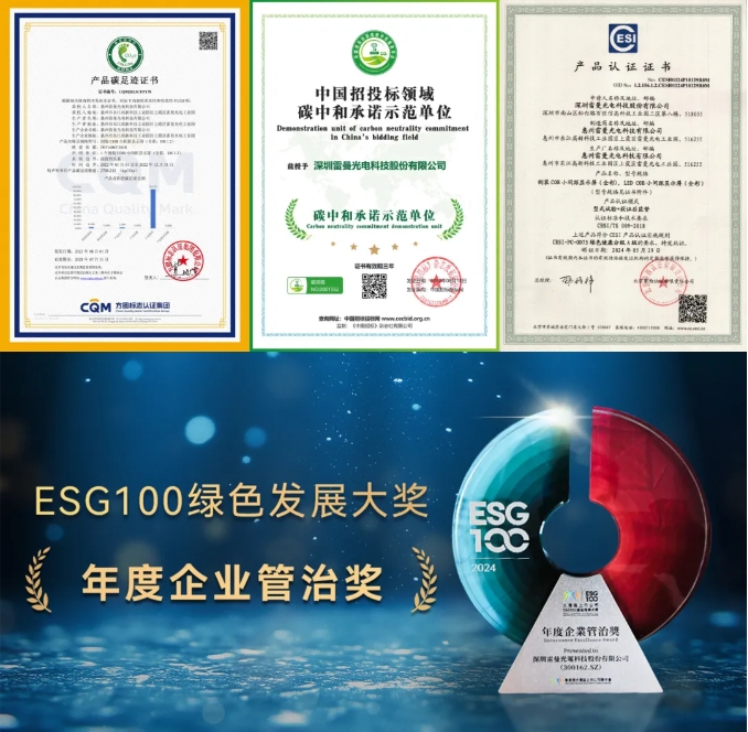 社會各界也對雷曼光電在可持續發展領域的卓越表現和持續努力給予高度贊譽和認可。2022年,雷曼光電被授予“碳中和承諾示范單位”稱號。2023年,雷曼PSE雷鳴系列COB節能冷屏獲得“產品碳足跡證書”。2024年,雷曼光電全系列COB一體機獲得一級能效標識,全系列COB小間距顯示屏也獲評綠色健康分級A級。同年,雷曼光電榮獲“ESG100綠色發展大獎-年度企業管治獎”。