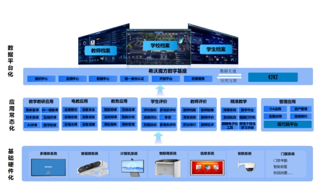 學校從數據的平臺化、應用常態化、基礎硬件化這三個層級有序來推進學校的數字化發展。并依托希沃和釘釘專業的技術能力,整合學校的現有的應用和數據的互通,搭建教研平臺、設備管理平臺、學生綜合素質評價平臺,協同釘釘家校管理平臺構建一個高效、便捷、智能的數字化教育教學與管理環境,推動學校整體運營水平的提升。學校經過不斷的實踐和評估,總結經驗教訓,將數字化轉型推向常態化,最終構建幸福教育,為學生和教師的成長提供有力支持。