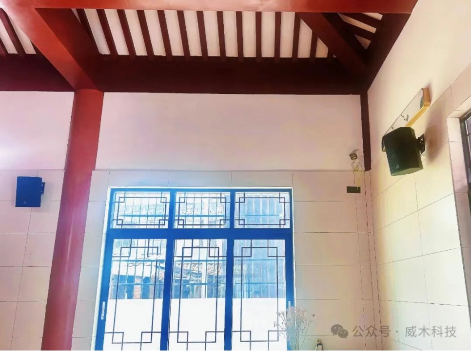大殿外2只優質戶外防水音柱音色極佳,采用鋁鎂合金制作的外殼,可抵擋日曬、風吹、雨淋。配置多臺2通道數字功放,1U鋁面板設計,采用CLASS D轉換速度快,聲音通透亮麗,加上強大的處理和保護性能,高效保障揚聲器系統的使用安全。