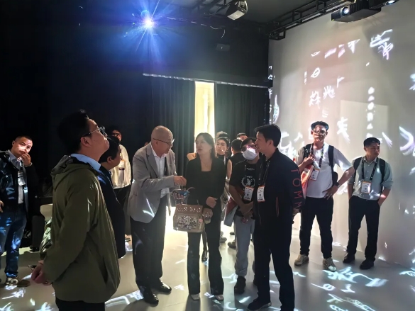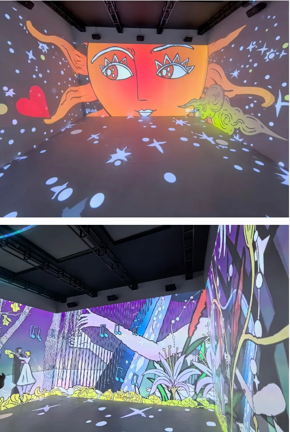 佳聯公司憑借多年對沉浸式空間的鉆研,全力打造特色沉浸空間,提升臨場感。采用4K分辨率全色彩投影機提升畫質;定制“沉浸式環繞音效”實現音畫完美匹配,配合高端的圖像渲染服務器Disguise EX3,帶來流暢畫質與一鏡到底的極致體驗。此外,特邀中數藝公司,融合優質作品與原創 IP,帶來獨特沉浸體驗。