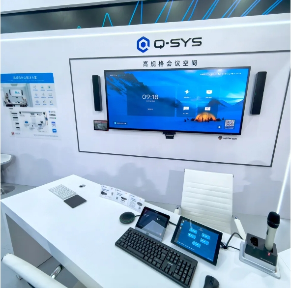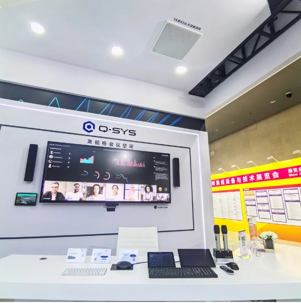 在高規格會議空間體驗區,部署騰訊會議和Teams兩套會議平臺。觀眾通過桌面觸摸屏體驗一鍵入會、一鍵預約、會議日程同步、會議記錄及總結等線上會議功能,利用空間音頻技術讓發言者聲音精準定位,會議過程中可通過MTR控制器便捷控制燈光、窗簾、電視等第三方會議室設備。全網絡化數字產品帶來的會議信息聯動顯示和高品質本地擴聲,為參會者帶來全新會議體驗。