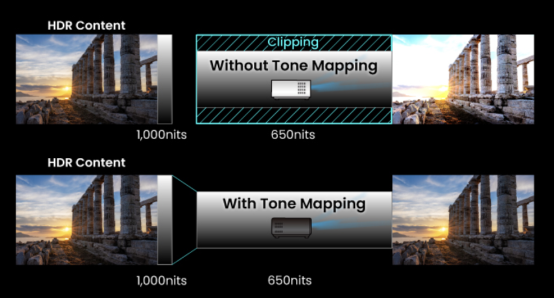 雖說影像行業(yè)已步入HDR時(shí)代,可傳統(tǒng)HDR投影設(shè)備通常采用靜態(tài)色調(diào)映射,在處理動(dòng)態(tài)電影畫面時(shí)容易產(chǎn)生高光過曝、暗部細(xì)節(jié)丟失或色彩失真等問題。明基動(dòng)態(tài)逐幀映射技術(shù)通過解析HDR畫面內(nèi)容,智能調(diào)節(jié)亮度與色彩參數(shù),突破了傳統(tǒng)顯示的固有局限。在播放HDR片源時(shí),能有效消除運(yùn)動(dòng)模糊與色彩斷層,帶來更自然流暢的真實(shí)觀感。不論是朝霞云影的細(xì)膩漸變,還是霓虹湖景的璀璨光影,均能展現(xiàn)豐富的層次與細(xì)節(jié)。