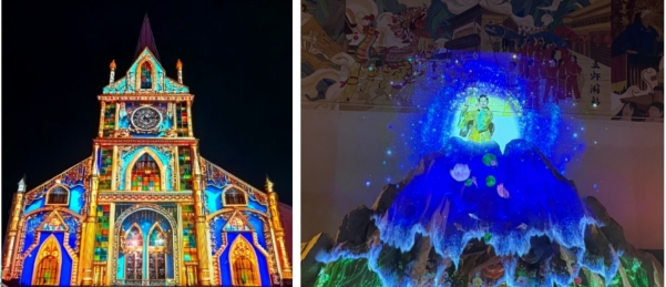 令人贊嘆不已的“玫瑰之約”教堂立面投影(左)和“仙影闌珊”仿真花裙投影(右)