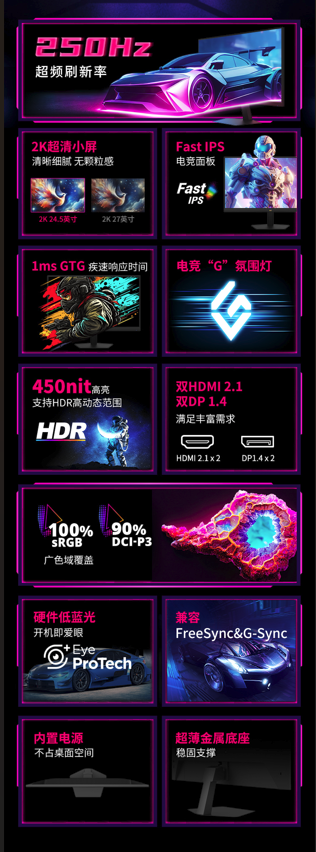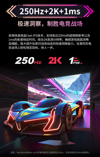 相比傳統(tǒng)60Hz或144Hz顯示器,250Hz刷新率可將畫面更新頻率提升至每秒250幀,極大減少畫面撕裂與卡頓現(xiàn)象,確保每一次鼠標移動、每一次技能釋放都精準呈現(xiàn)。1ms響應時間則有效降低動態(tài)模糊與殘影,提升目標識別效率,尤其適合高強度競技游戲。