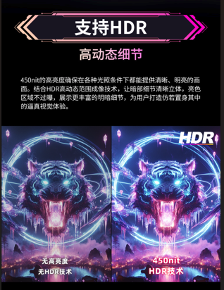 同時,顯示器支持HDR高動態(tài)范圍顯示,峰值亮度高達450尼特,對比度更強,色彩更豐富。游戲中,無論是城市的霓虹夜景,還是野外的自然風光,都能展現(xiàn)出更真實、更具層次感的視覺效果。