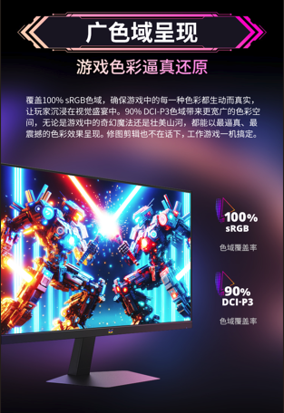 此外,顯示器覆蓋100% sRGB與90% DCI-P3廣色域,色彩還原準確,確保游戲中每一種色彩都能生動而真實,不只能讓電競玩家沉浸在視覺盛宴中,也適合內(nèi)容創(chuàng)作者進行視頻剪輯、圖像處理等工作,工作游戲一機搞定。