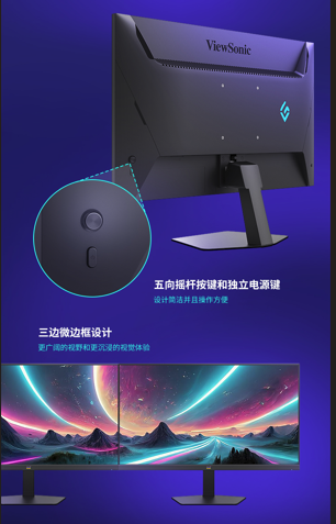 金屬設(shè)計底座,穩(wěn)固而不占桌面空間,兼顧電競風格與實用性,確保在激烈操作中依然保持穩(wěn)定。三邊微邊框設(shè)計,帶來更廣闊的視野和更沉浸的視覺體驗,配合五向搖桿按鍵和獨立電源鍵,讓操作更方便。