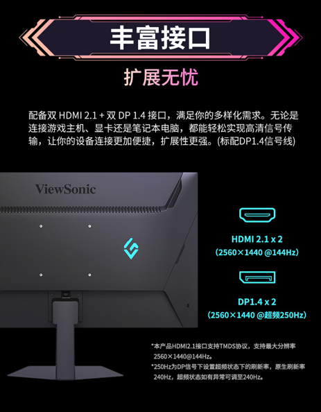 在連接性方面,VX25G26-2K配備HDMI 2.1×2與DP 1.4×2等主流高速接口,支持各類顯卡與游戲主機,輕松實現(xiàn)高幀率輸出與HDR畫質(zhì)。無論是PC、PS5、Xbox Series X,還是多屏擴展、外設(shè)連接,都能輕松應對。