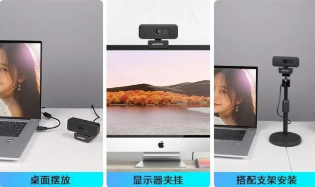 配備防滑防震多功能底座,底部橡膠墊增強摩擦力,即使桌面輕微震動也能保持畫面穩定;支持水平360°旋轉與上下俯仰調節,輕松調整拍攝角度,適配桌面擺放、顯示器夾持、三腳架安裝(通過1/4英寸標準螺孔)等多種模式,滿足遠程辦公,視頻會議,在線面試、遠程簽約等差異化場景需求。