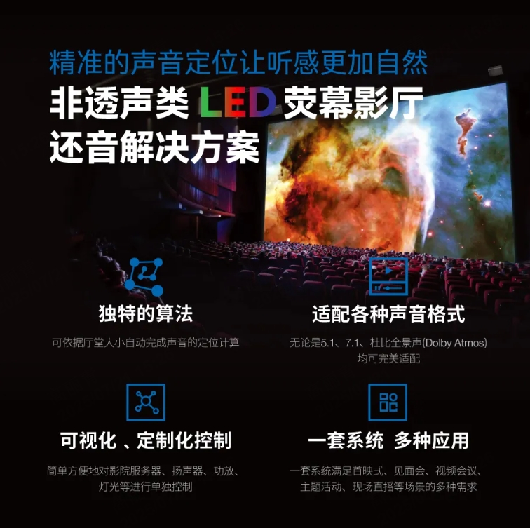在觀眾期待更好觀影體驗的今天,LED熒幕以其數倍于反射式投影的峰值亮度、100%的亮度均勻度、接近∞:1的對比度以及寬廣的色域范圍,成為觀影的熱門選擇;但LED熒幕不透聲的特性,導致了傳統還音解決方案無法應用在LED熒幕影廳中。如何為觀眾奉上生動的還音效果,成為了眾多業主最為關心的問題。佳聯基于對影院聲音技術的深刻理解和7000多個影廳的項目經驗,為非透聲及透聲熒幕影廳量身打造的LED熒幕影廳擴聲解決方案可以適配5.1、7.1及杜比全景聲等格式的影音回放要求。