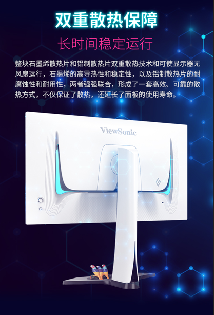 在高性能輸出的背后,XG273-4K-OLED-2采用了石墨烯+鋁制散熱片的雙重散熱結構,實現了無風扇靜音運行。石墨烯具備極高的導熱性與穩定性,能迅速將熱量從核心區域導出;鋁制散熱片則具備優異的耐腐蝕性與結構強度,確保長時間使用依然高效可靠。兩者協同作用,構建出一套高效、靜音、耐用的散熱系統,不只保障了顯示器在高負載下的穩定運行,還有效延長了面板壽命。無論是長時間游戲、直播還是創作,都能保持冷靜輸出,助玩家穩定發揮。