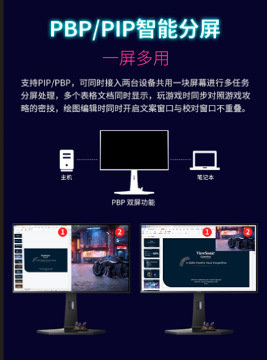 XG273-4K-OLED-2不只是一臺電競顯示器,更是多任務處理的得力助手。PBP/PIP分屏功能讓玩家可以同時接入PC和游戲主機,或者邊游戲邊查閱攻略,提升效率。