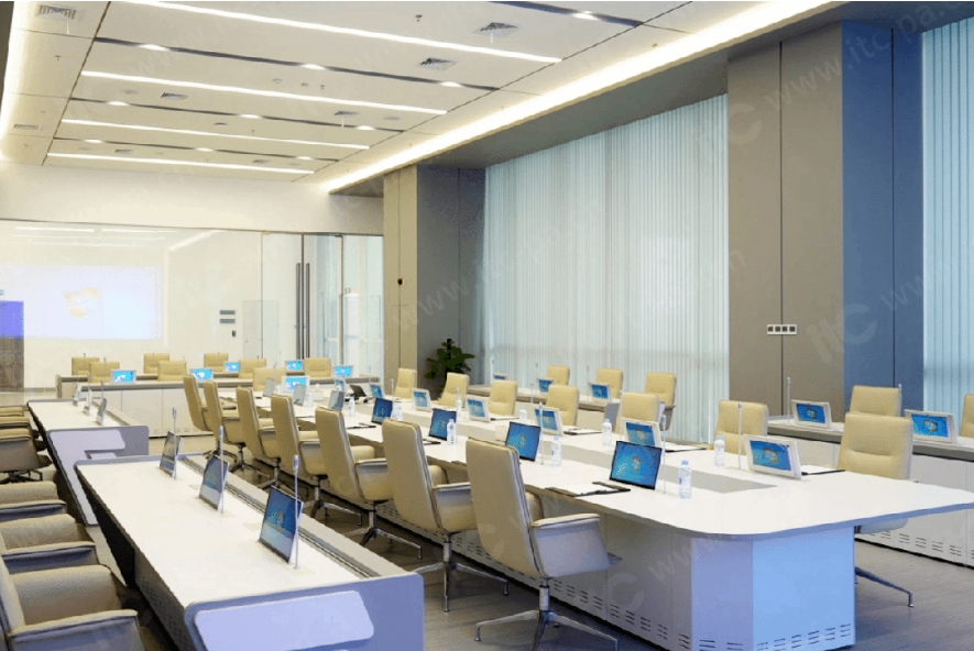 針對氣象中心會商研判與技術研討的高頻次會議需求,itc為其兩大會議場景部署了自研的國產雙面屏無紙化系統。該系統高度集合升降式數字會議話筒、無紙化終端主機、高清網絡編碼模塊等多種媒體設備,可實現無紙化升降器、數字會議單元的統一升降管理,完美適配氣象中心高端會議場景。
