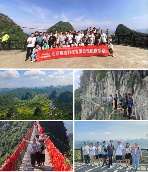 次日清晨,我們登臨了擁有懸空索道、玻璃棧道的如意峰,這里是俯瞰喀斯特地貌的絕佳去處。面對高空挑戰,視通伙伴們攜手前行,最終全員成功登頂,在壯闊山川間深化了團隊協作的默契。
