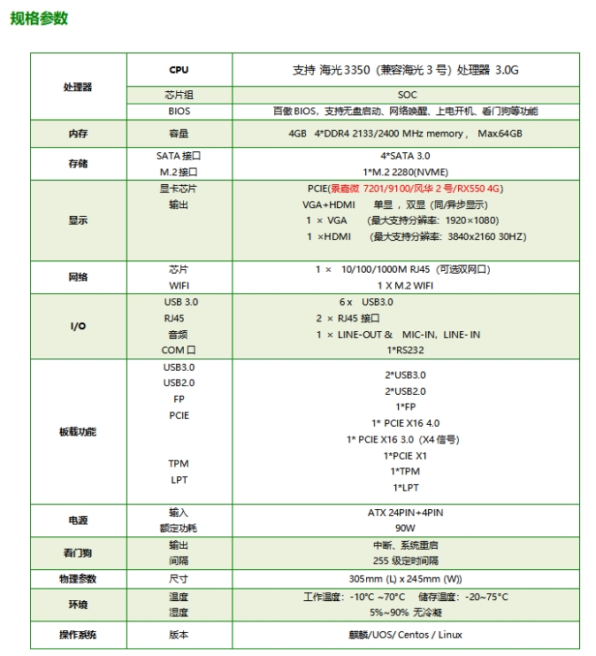 國(guó)產(chǎn)海光 HG-3230/HG-3350,兆芯 KX-6640A/KX-6640MA/KX-6580/KX-U6780A,飛騰 FT-2000/FT-D-2000國(guó)產(chǎn)操作系統(tǒng)(UOS/Deepin/Kylin),還可以支持國(guó)產(chǎn)顯卡(景嘉微7201/芯動(dòng)A4/芯動(dòng)A6 2~4G可選 )