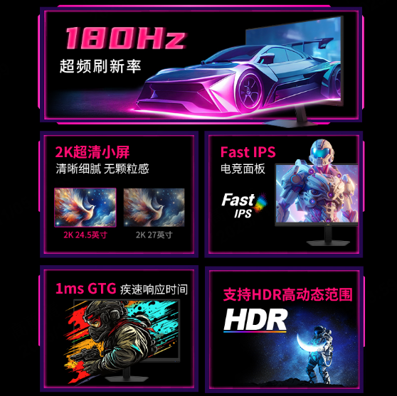 刷新率與響應速度是電競顯示器的核心性能指標。VX25G26-2K-2支持180Hz高刷新率,遠超傳統60Hz或144Hz標準,為FPS、MOBA、賽車等高速動態游戲提供更順滑的畫面表現。配合1ms GTG疾速響應時間,有效消除拖影與動態模糊,確保玩家在激烈對戰中實現精準操作反饋。