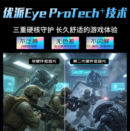 長時間游戲或辦公,眼部疲勞成為影響效率與健康的重要因素。VX24G25搭載先進的Eye ProTech+護眼方案,集成硬件級低藍光與不閃屏技術,從源頭減少有害藍光輻射,有效緩解眼部干澀與疲勞感。
